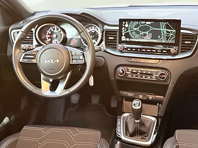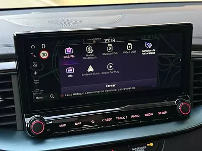 Mandos de control de audio en el volante, Navegador con pantalla multifunción táctil (de 12”), Android Auto / Apple Carplay y conectividad Kia Connect, Control de velocidad de crucero, Asistente de seguimiento de carril, Sistema de control de presión neumáticos, Detector de fatiga del conductor, Cámara trasera de asistencia al aparcamiento, Sensor de lluvia y luces, Sensores de aparcamiento traseros, Retrovisores exteriores eléctricos, Llantas de aleación de 16”, Sistema de frenada de emergencia, etc.